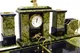 Изготовлен из малахита и долерита, элементы декора выполнены из бронзы, часы с кварцевым механизмом.